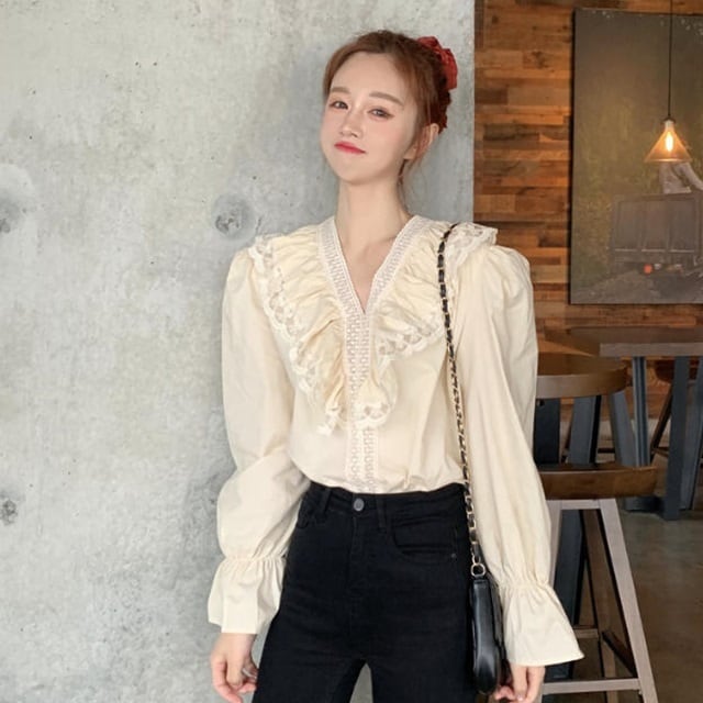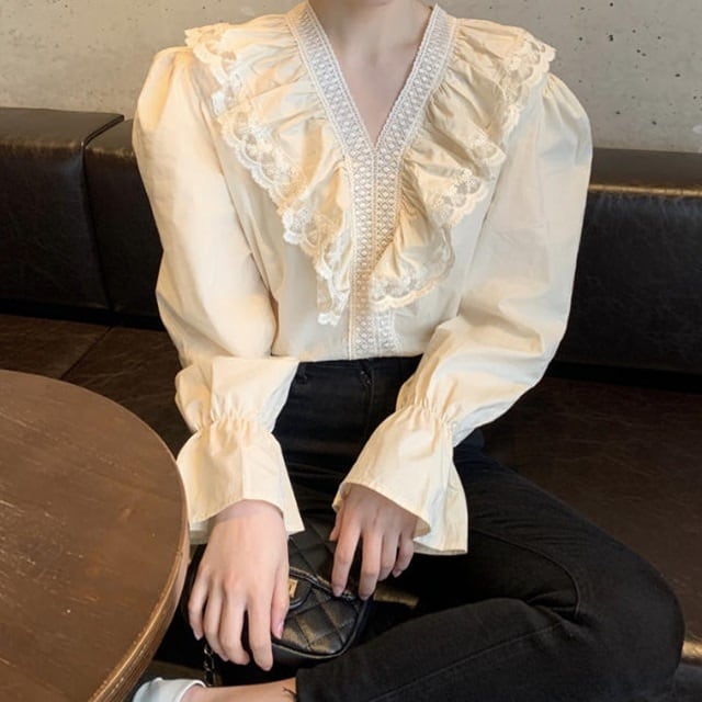 【送料無料】ブラウス シャツ トップス レース Vネック フリル キャンディスリーブ ゆったり 長袖 エレガント キレイ目 上品 大人可愛い フェミニン ガーリー お出かけ デート 普段使い デイリー 着回し TP-226IU