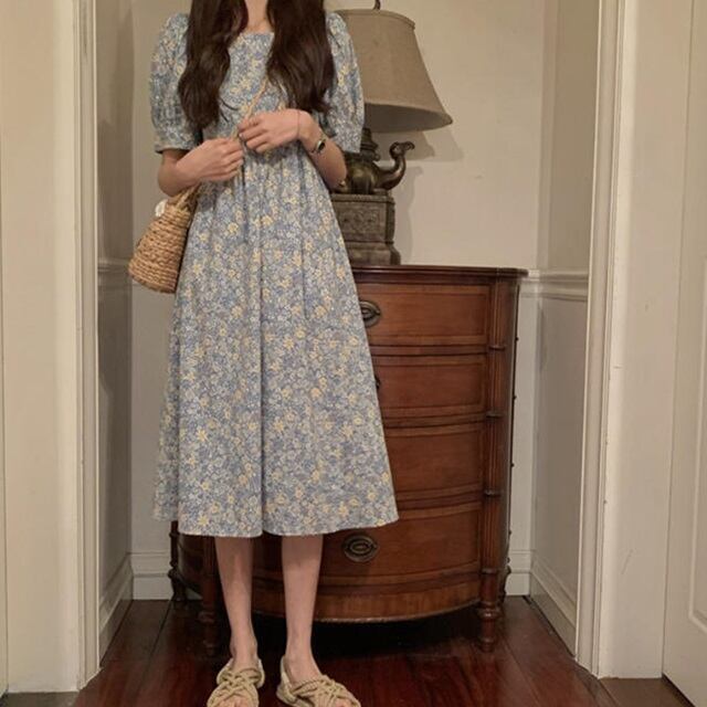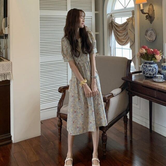 【送料無料】花柄ワンピース ロング パフスリーブ 上品 キレイ目 ゆったり 半袖 レトロ フェミニン ガーリー お出かけ デート 普段使い デイリー OP-135IU