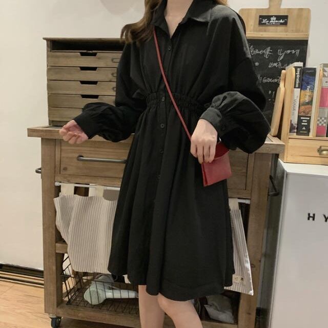 【送料無料】シャツワンピース 膝丈 ボリューム袖 ギャザー フレア Aライン 長袖 無地 ゆったり シンプル ベーシック おしゃれ カジュアル ガーリー お出かけ デート 普段使い デイリー OP-139IU