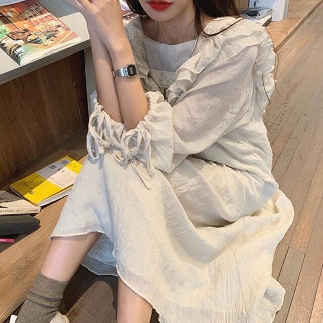 【送料無料】ワンピース ロング ナチュラル スクエアネック 肩フリル ボリューム袖 長袖 シンプル ゆったり 体型カバー カジュアル ガーリー 大人可愛い デート お出かけ デイリー 普段使い OP-140IU