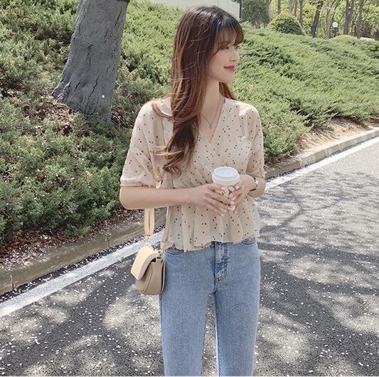 【送料無料】リトルハート ペプラムブラウス シフォン Vネック 短丈 ショート 半袖 春 夏 レディース 韓国 大人フェミニン ラブリー ガーリー 大人可愛い 通勤 通学 デイリー 普段使い タウン 休日 お出かけ 女子会 デート ライトベージュ ブラック 2色 TP-017KI