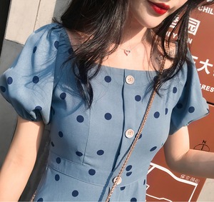 【送料無料】2カラー ワンピース ドット柄 スクエアネック レトロ ウエストマーク ミディ丈 膝下丈 Aライン 半袖 パフ袖 前ボタン 韓国トレンド 大人ガーリー 上品 大人フェミニン 清楚感 春夏 ブルー アプリコット 通勤 通学 バカンス 旅行 リゾート ホリデー お出かけ デート お呼ばれ 女子会 OP-149KW