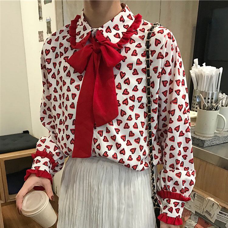 【送料無料】ハート柄リボンブラウス フリル レディース 長袖 韓国 ルーズ 大人ガーリー キュート ラブリー 大人フェミニン レトロ 大人可愛い 通勤 通学 デイリー 普段使い タウン 休日 お出かけ 女子会 デート ワンカラー TP-018KI