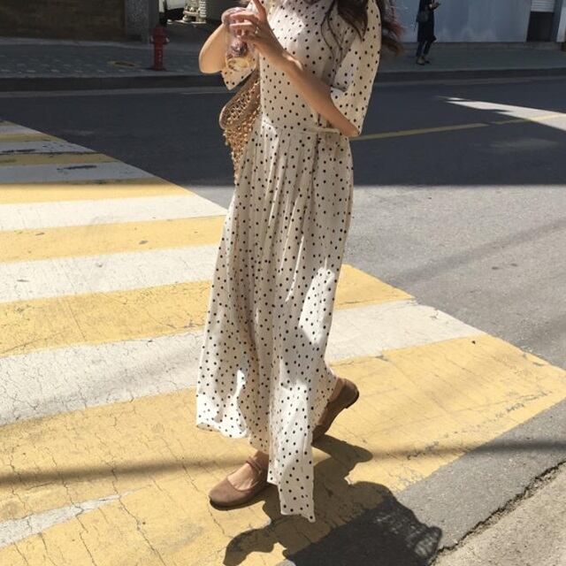 【送料無料】ドット柄 ワンピース ロング リボン シンプル おしゃれ ゆったり 半袖 カジュアル レトロ 大人可愛い お出かけ デート 普段使い デイリー 着回し OP-160IU