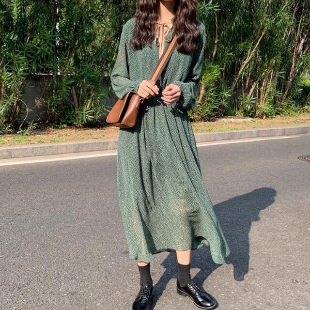 【送料無料】ドット柄 ワンピース シフォン 軽やか ロング リボンタイ フレア Aライン ゆったり 長袖 レトロ 大人可愛い カジュアル お出かけ デート 普段使い デイリー 着回し OP-175IU