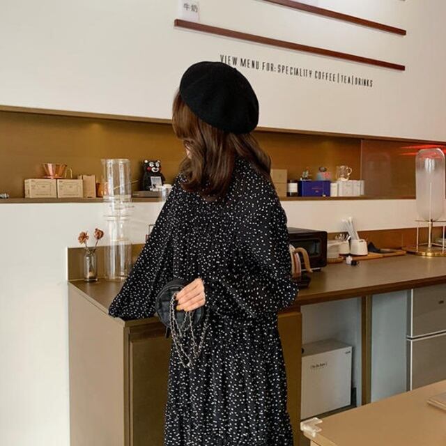 動くたびに揺れるロング丈のドット柄ワンピース♪