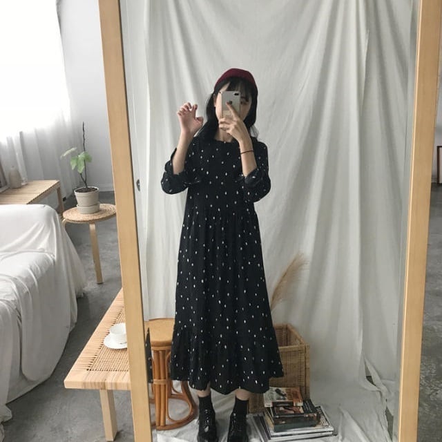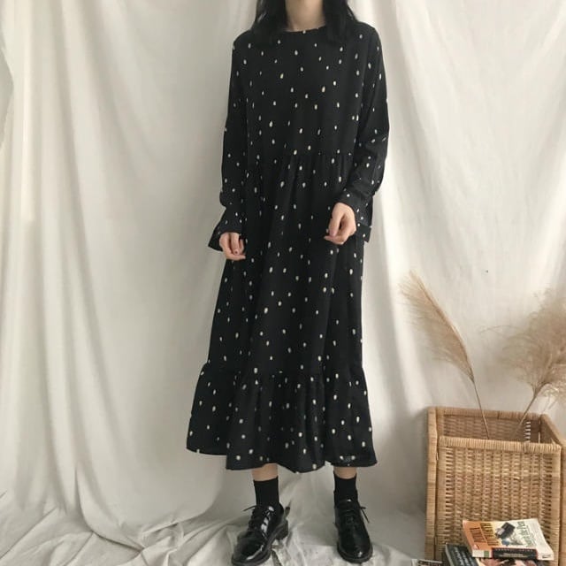 【送料無料】ドット柄 ワンピース ティアード フレア ロング 長袖 ゆったり レトロ カジュアル シンプル おしゃれ 大人可愛い お出かけ デート 普段使い デイリー 着回し OP-185IU