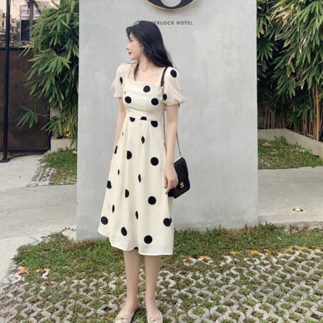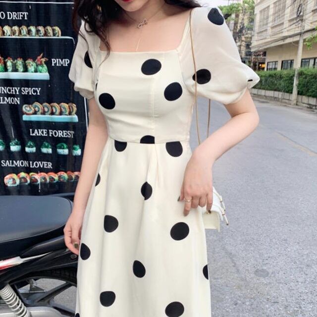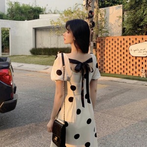 【送料無料】ドット柄 ワンピース 膝丈 バックコンシャス リボン スクエアネック フェミニン 大人可愛い キレイ目 エレガント お出かけ デート 普段使い デイリー OP-188IU