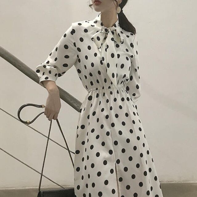 ボウタイリボンがレトロな印象のドット柄ワンピース♪
