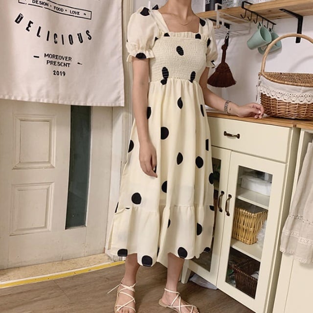 【送料無料】ドット柄 ワンピース ロング ミモレ丈 バックコンシャス リボン シャーリング パフスリーブ フェミニン 大人可愛い お出かけ デート 普段使い デイリー OP-192IU