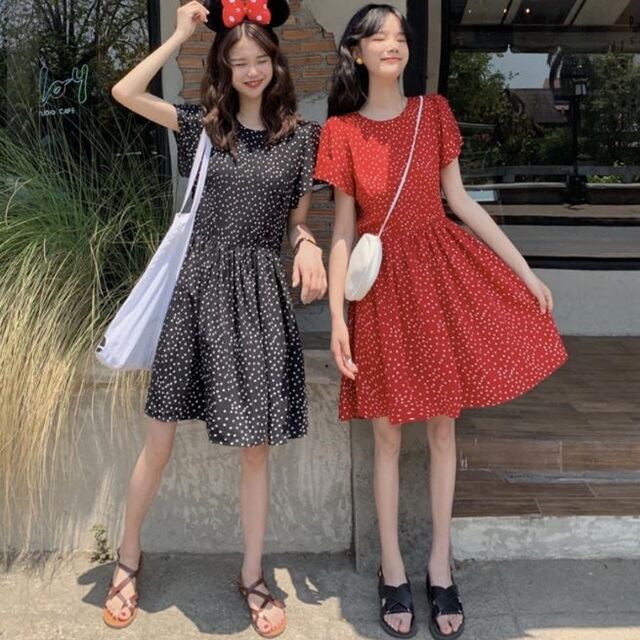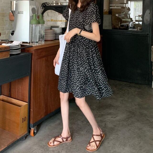 【送料無料】ドット柄 ワンピース 膝丈 フレア Aライン ゆったり 半袖 レトロ ガーリー カジュアル お出かけ デート 普段使い デイリー OP-202IU