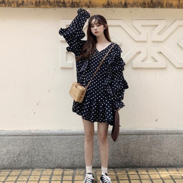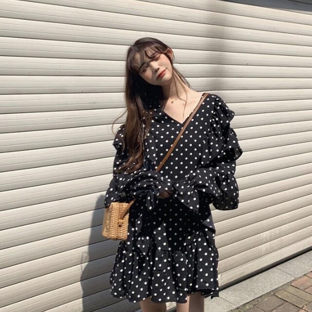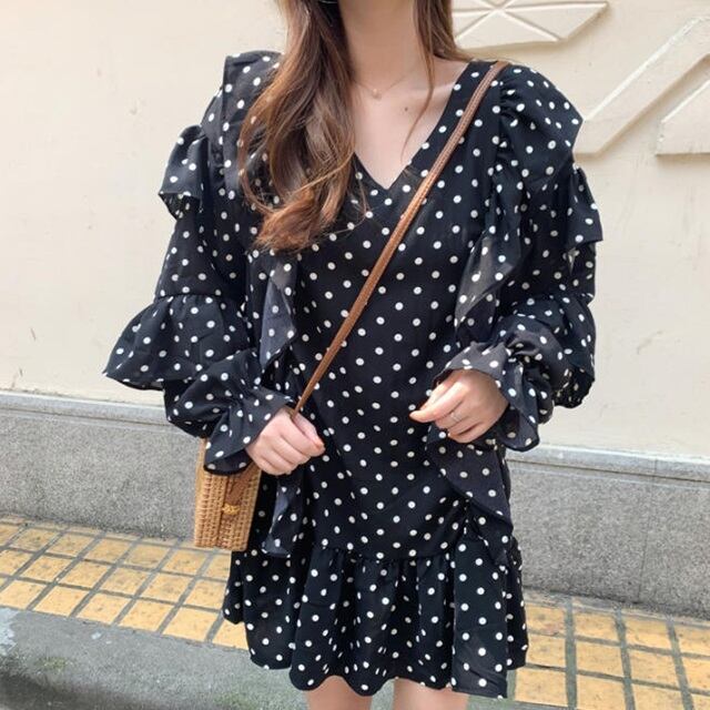 【送料無料】ドット柄 チュニックワンピース 膝丈 Vネック フリル ゆったり 長袖 ガーリー カジュアル レトロ お出かけ デート 普段使い デイリー 着回し OP-204IU