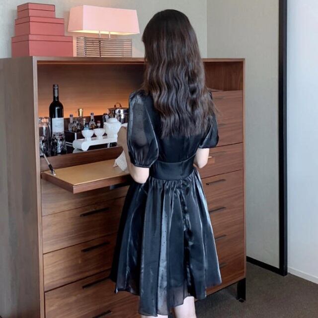 【送料無料】ドット柄 ワンピース ミニ丈 Vネック 光沢 ハイウエスト Aライン フレア 半袖 ガーリー キレイ目 エレガント パーティ お出かけ デート 普段使い デイリー OP-205IU