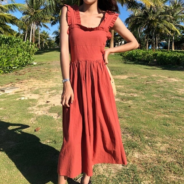 【送料無料】ロングワンピース キャミソール ノースリーブ フリル ゆったり セクシー カジュアル 大人可愛い レトロ リゾート お出かけ デート 普段使い デイリー 着回し OP-242IU