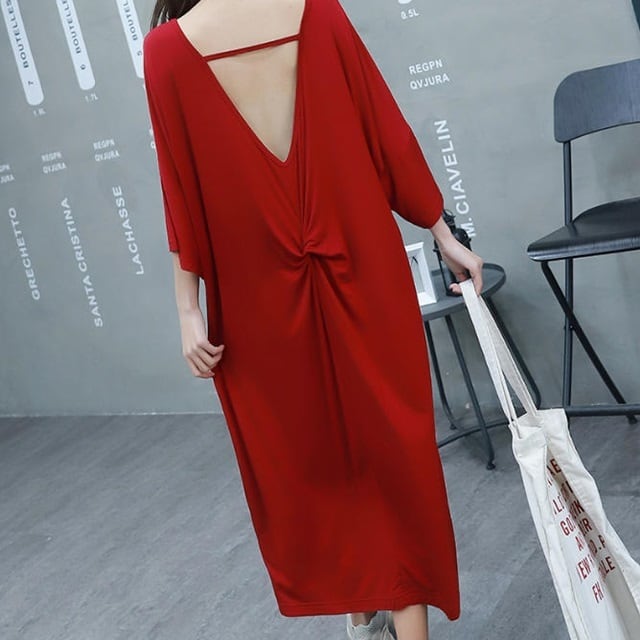 【送料無料】Tシャツワンピース ロング バックコンシャス Vライン ルーズ 体型カバー オーバーサイズ ゆったり 無地 お出かけ デート 普段使い デイリー ラフ OP-252IU
