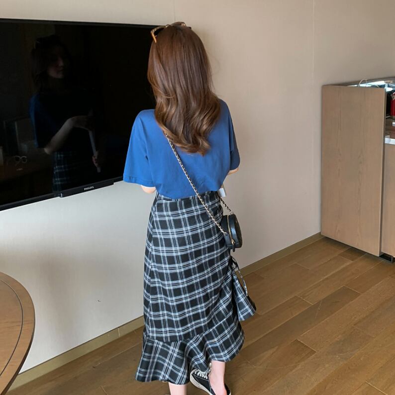 【送料無料】セットアップ チェックスカート ミモレ丈 Tシャツ 半袖 フィッシュテール 引きリボン アシンメトリー ブルー&ブラック 大人ガーリー 大人カジュアル 大人フェミニン オシャレ キュート 清楚感 春夏 通学 タウン シティー デート お出かけ デイリー 女子会 普段使い ST-073KW