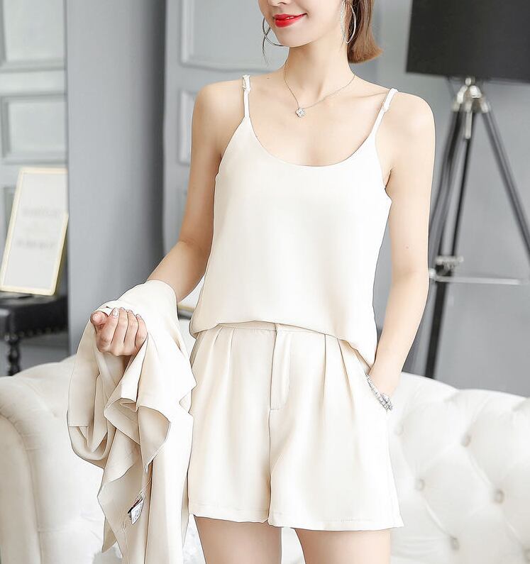 お揃い色の半袖ジャケット、キャミトップ、ショートパンツのスリーピース全3色です♡ 色々トップスを組み合わせるのが楽しい★ パンツは大腿周りがワイドで動き易さ◎ コーデに悩まずこのセット一つで直ぐお出かけできる便利なアイテムです♬