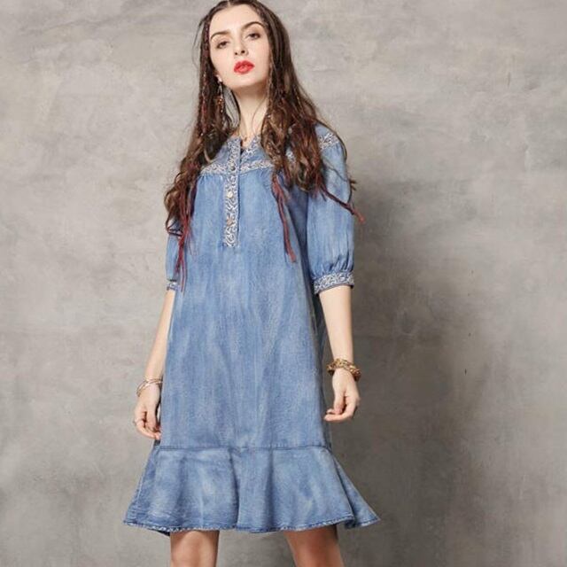 【送料無料】デニムワンピース 膝丈 裾フレア おしゃれ 五分袖 ゆったり 大人可愛い ガーリー カジュアル お出かけ デート 普段使い デイリー OP-269IU