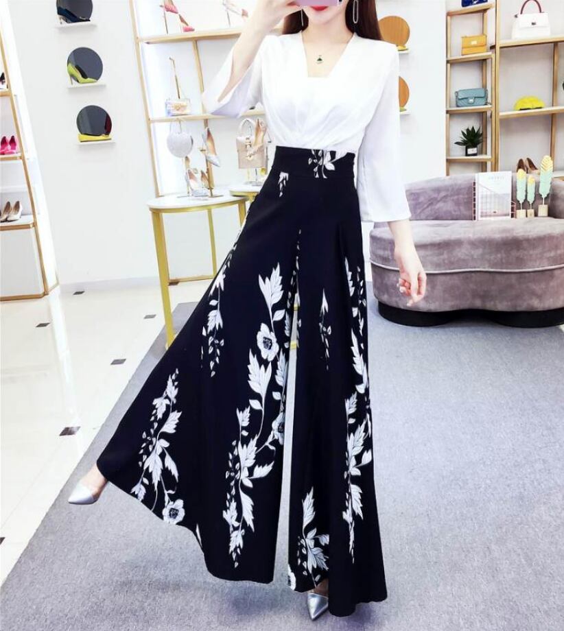 七分袖のホワイトブラウスと花柄のブラックパンツのセットです♡ ブラウスはカシュクールで胸元きれいめ★ パンツフレア状のワイドレッグパンツはスカンツ風で全体がドレスのよう♪ 特別なお出かけ、お呼ばれにぴったりエレガントなセットアップです♬