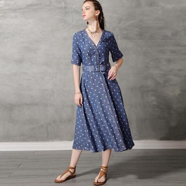 【送料無料】デニムワンピース ロング ミモレ丈 Vネック 星柄 ハイウエスト ベルト付き フレア カジュアル ガーリー 大人可愛い おしゃれ お出かけ デート 普段使い デイリー OP-288IU