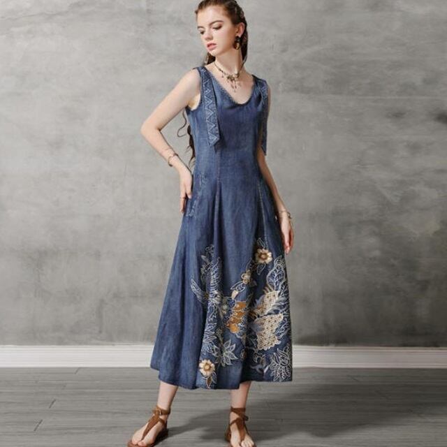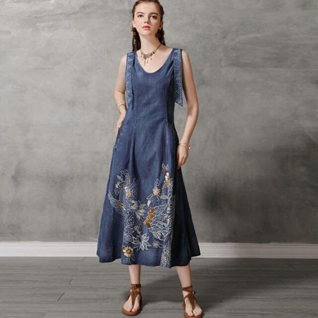 【送料無料】デニムワンピース ロング Vネック 刺繍 ノースリーブ おしゃれ レトロ カジュアル 大人可愛い お出かけ デート 普段使い OP-299IU