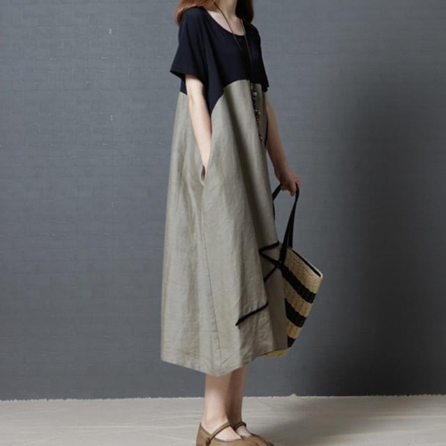 【送料無料】リネンワンピース ロング ミモレ丈 ナチュラル 大きいサイズ バイカラー おしゃれ ハイウエスト フレア カジュアル 大人可愛い お出かけ デート 普段使い デイリー 着回し OP-353IU