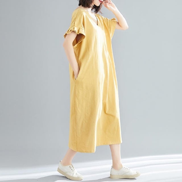 【送料無料】リネンワンピース コットン ミモレ丈 ロング ナチュラル 大きいサイズ Vネック 半袖 ゆったり シンプル 大人可愛い カジュアル お出かけ デート 普段使い デイリー 着回し OP-387IU