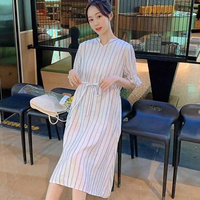 【送料無料】リネンワンピース ナチュラル 大きいサイズ ミモレ丈 ストライプ ウエストリボン 大人可愛い キレイ目 爽やか お出かけ デート 普段使い デイリー 着回し OP-400IU
