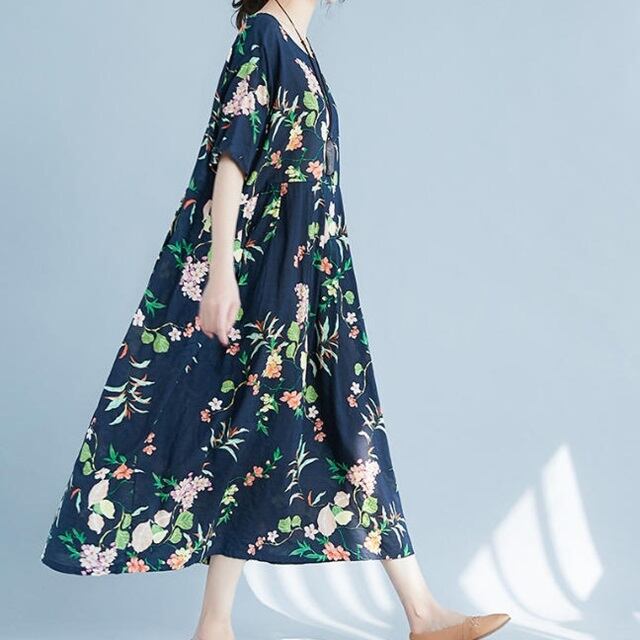 【送料無料】花柄ワンピース ロング 半袖 ゆったり 体型カバー 大人可愛い フェミニン 上品 カジュアル お出かけ デート 普段使い デイリー 着回し OP-409IU
