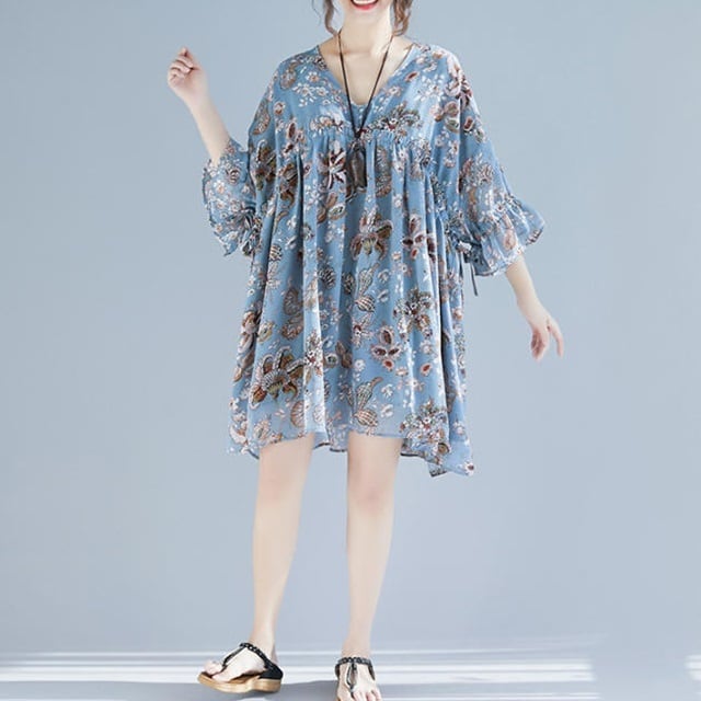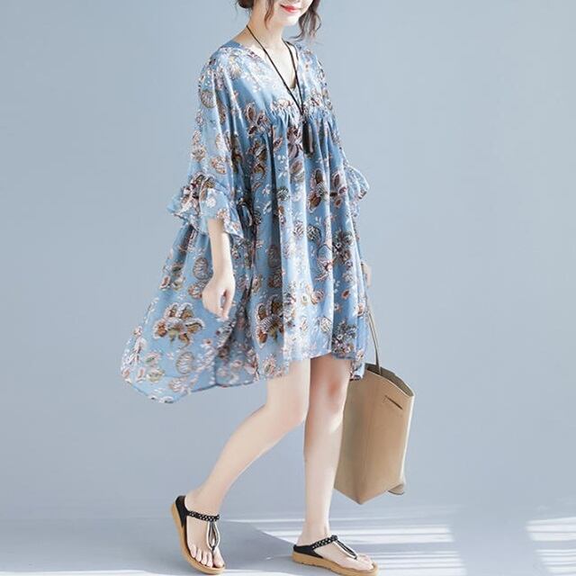 【送料無料】花柄ワンピース 半袖 膝丈 Vネック フレア レトロ ゆったり 体型カバー 大人可愛い カジュアル おしゃれ お出かけ デート 普段使い デイリー 着回し OP-435IU