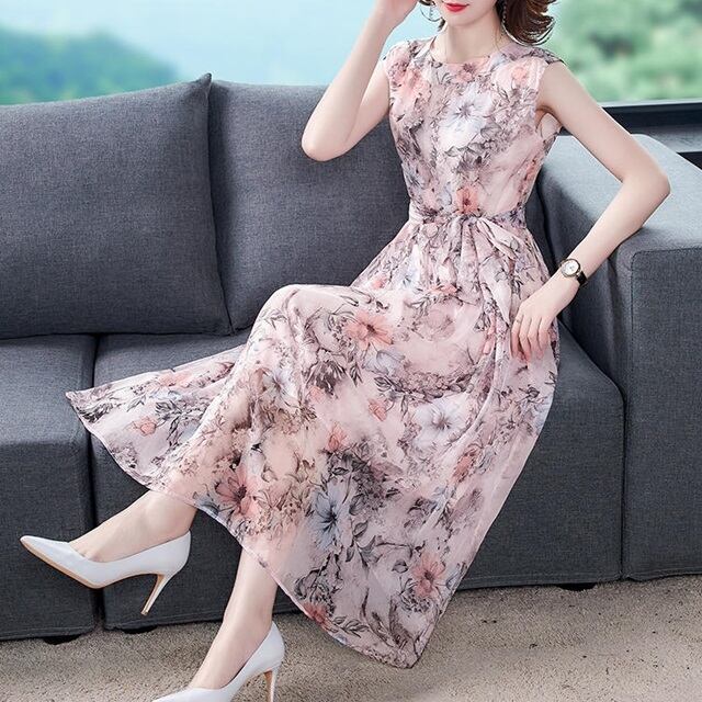 【送料無料】花柄ワンピース ロング ノースリーブ 大きいサイズ ゆったり ハイウエスト フレア フェミニン キレイ目 上品 エレガント お出かけ デート お呼ばれ 普段使い デイリー 着回し OP-448IU