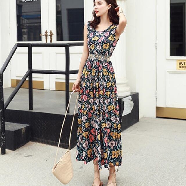 【送料無料】花柄ワンピース ノースリーブ ロング マキシ丈 大きいサイズ ハイウエスト フレア Aライン 大人可愛い キレイ目 上品 お出かけ デート 普段使い デイリー リゾート OP-449IU