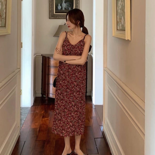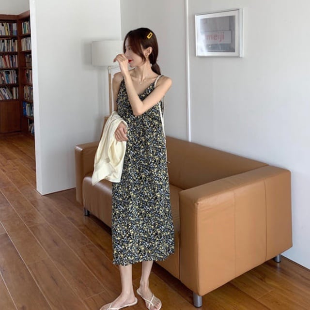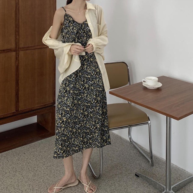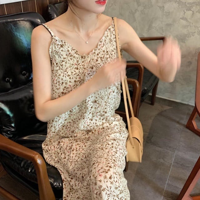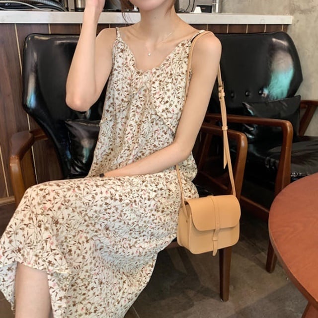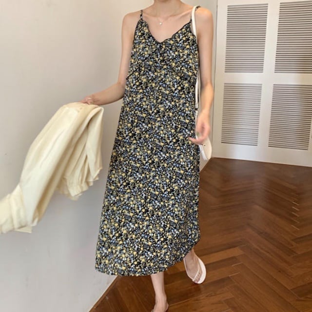 【送料無料】花柄 キャミソールワンピース ロング ミモレ丈 フレア フリル ゆったり 体型カバー カジュアル 大人可愛い フェミニン 上品 お出かけ デート 普段使い デイリー 着回し OP-471IU