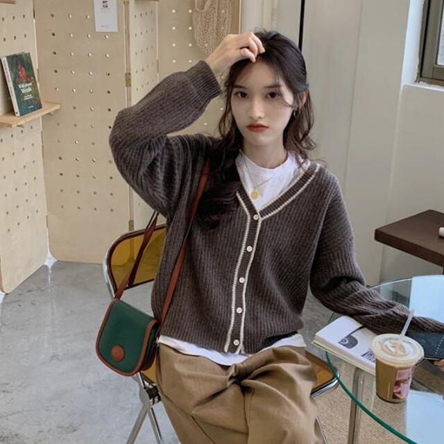 【送料無料】ニットカーディガン トップス 羽織 リブ Vネック ゆったり 長袖 大人可愛い カジュアル レトロ シンプル ベーシック お出かけ デート 普段使い デイリー 着回し TO-327IU
