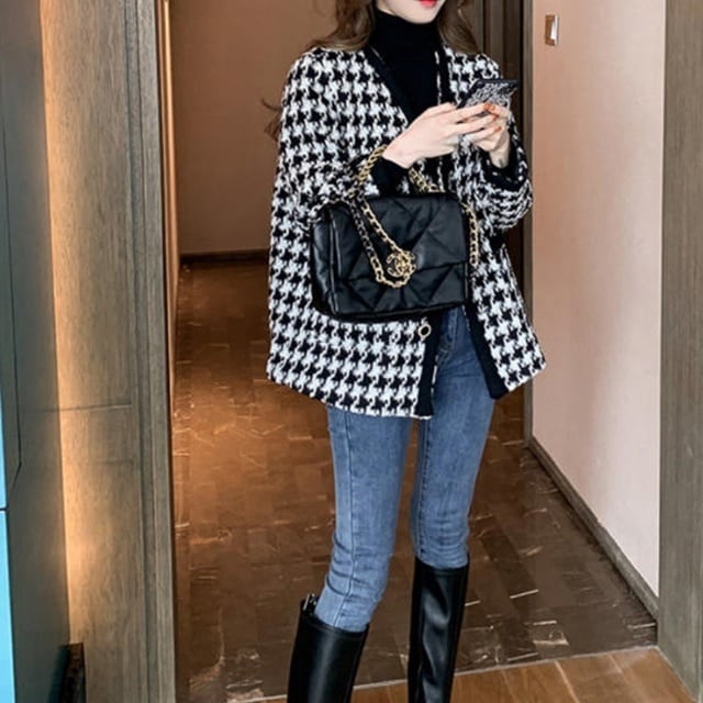 【送料無料】ノーカラージャケット アウター 羽織 千鳥格子 長袖 ゆったり 無地 シンプル 大人可愛い カジュアル ベーシック エレガント きれいめ お出かけ デート 普段使い デイリー 着回し 通勤 OT-314IU