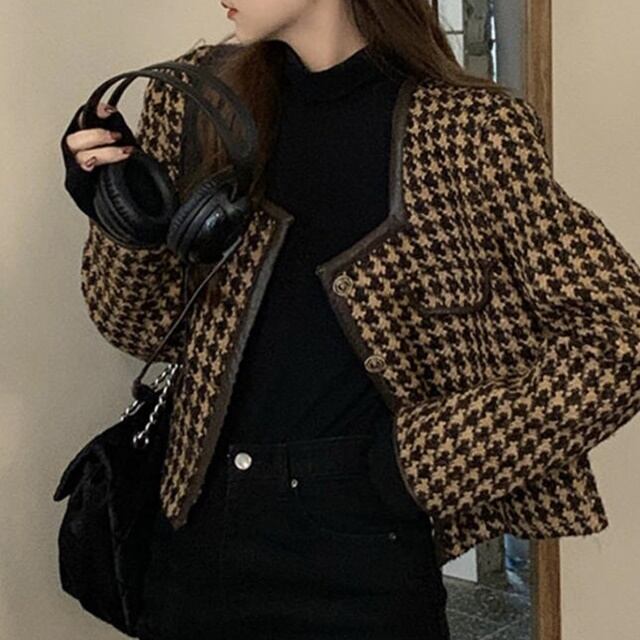 【送料無料】ノーカラージャケット アウター 千鳥格子 羽織 長袖 ゆったり 無地 シンプル 大人可愛い カジュアル レトロ ベーシック お出かけ デート 普段使い デイリー 着回し 通勤 OT-326IU