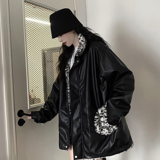 【送料無料】レザージャケット ファージャケット アウター リバーシブル 羽織 レオパード オーバーサイズ 長袖 無地 ゆったり きれいめ 甘辛 上品 きれいめ クール シック シンプル お出かけ デート 普段使い デイリー 着回し OT-373IU