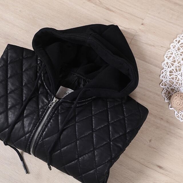 【送料無料】レザージャケット キルティングジャケット パーカー フード付き アウター 羽織 長袖 ゆったり きれいめ 甘辛 上品 きれいめ クール シック シンプル お出かけ デート 通勤 普段使い デイリー 着回し OT-432IU