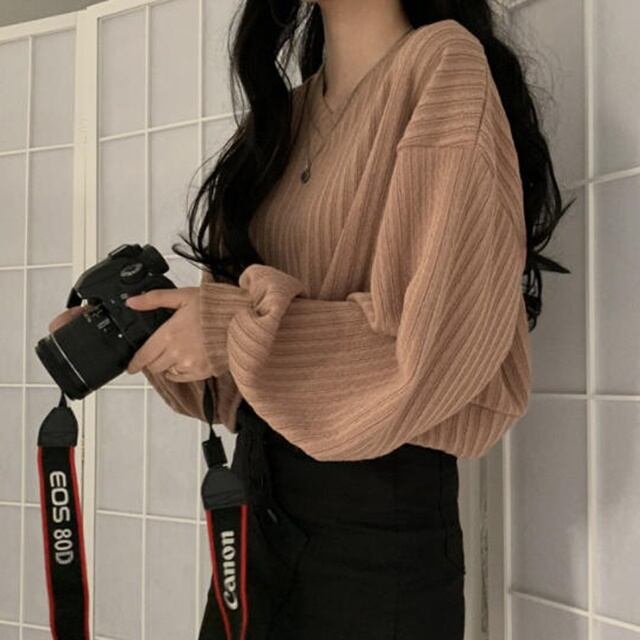 【送料無料】リブニット セーター トップス Vネック ボリューム袖 バルーンスリーブ 長袖 ゆったり カジュアル 大人可愛い シンプル お出かけ デート 普段使い デイリー 着回し TO-405IU
