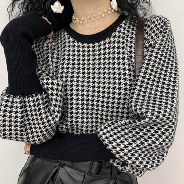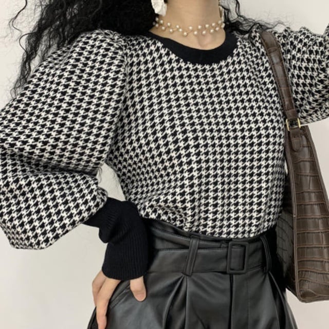 【送料無料】ニット セーター トップス 千鳥格子 ラウンドネック ボリューム袖 バルーンスリーブ 長袖 ゆったり 大人可愛い きれいめ 上品 エレガント お出かけ デート 普段使い デイリー 着回し TO-413IU