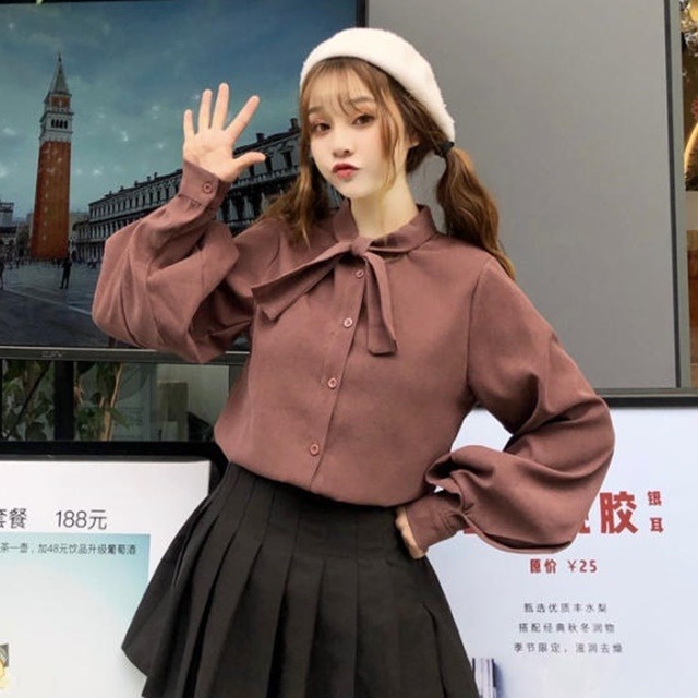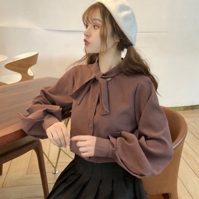 【送料無料】ブラウス シャツ トップス ボウタイリボン ボリューム袖 バルーンスリーブ 長袖 ゆったり 無地 大人可愛い カジュアル ガーリー レトロ シンプル お出かけ デート 普段使い デイリー 着回し TO-424IU