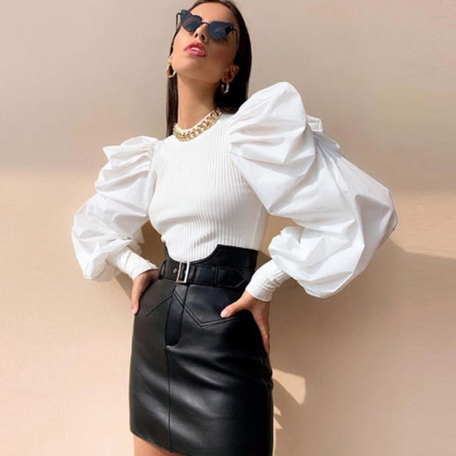 【送料無料】ニット ブラウス トップス ドッキング ボリューム袖 バルーンスリーブ ギャザー 長袖 スリム きれいめ エレガント 大人可愛い フェミニン お出かけ デート 普段使い デイリー 着回し TO-435IU