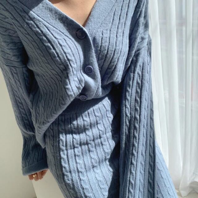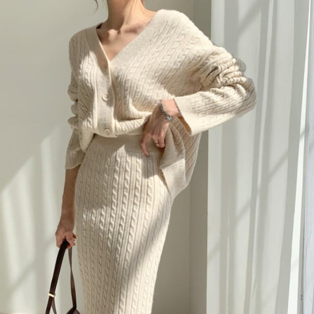 【送料無料】ニットセットアップ レディース セーターセットアップ スカート ロング 秋冬 タイト 大人 ひざ丈 ミモレ丈 トップス カーディガン ケーブル編み Vネック スリット ハイウエスト カジュアル 大人可愛い シンプル ST-016IU