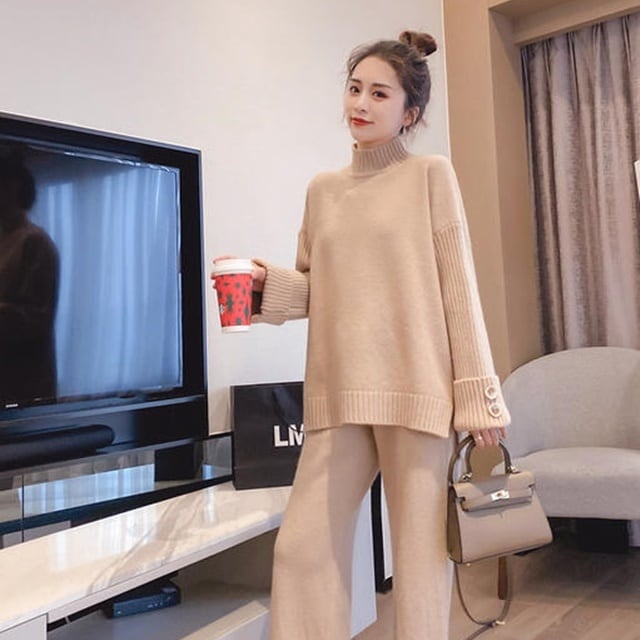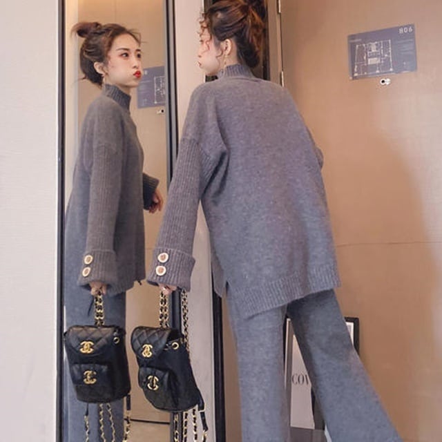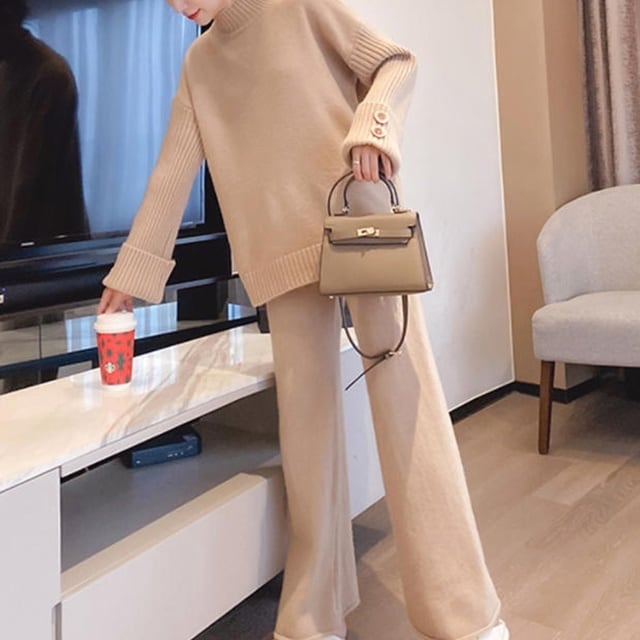 【送料無料】ニットセットアップ レディース パンツ セーターセットアップ 秋冬 ガウチョパンツ 暖かい ハイネック ニットトップス スリット ハイウエスト カジュアル 大人可愛い シンプル ST-017IU