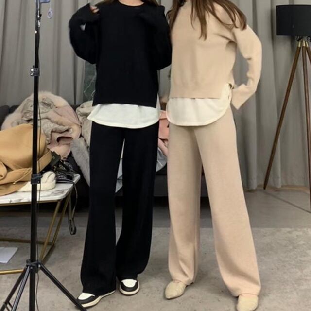 【送料無料】ニットセットアップ レディース パンツ 大きいサイズ セーターセットアップ 秋冬 ガウチョパンツ 暖かい ニットトップス 重ね着風 スリット ハイウエスト カジュアル 大人可愛い シンプル ゆったり 着回し 長袖 無地 大人 可愛い ST-020IU
