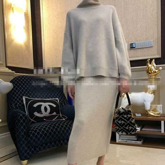 【送料無料】ニットセットアップ 大きいサイズ セーターセットアップ スカート ロング 秋冬 Aライン 大人 裏起毛 ひざ丈 ミモレ丈冬 30代 40代 ハイネック ベージュ ブラック ST-025IU