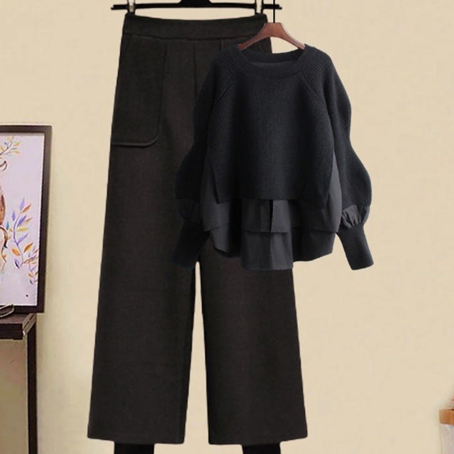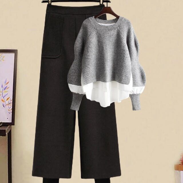 インナーシャツにニットトップスを重ね着しているように見える、おしゃれなセットアップ♪
