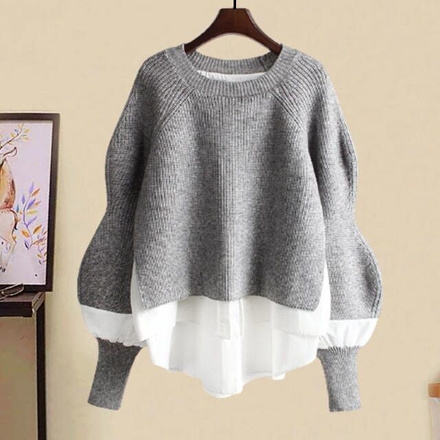 【送料無料】異素材トップス 異素材ドッキング ニット ゆったり リブニット 長袖 重ね着風 カジュアル おしゃれ 大人 グレー ブラック TO-442IU