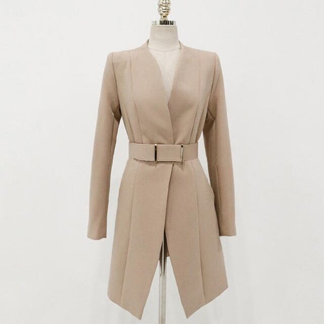 ウエストをキュッと引き締め、女性らしいメリハリのあるボディラインに見せてくれるフォーマルスーツ。勿論、ベルトをしないでジャケットをサッと羽織っていただいてもOK!