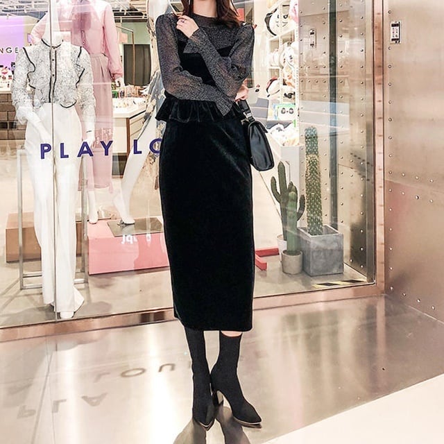 【送料無料】ワンピース 冬 長袖 きれいめ 秋冬 セットアップ ロング ブラウス シースルー セクシー フォーマル お呼ばれ コーデ 結婚式 二次会 20代 30代 40代 ブラック OP-482IU